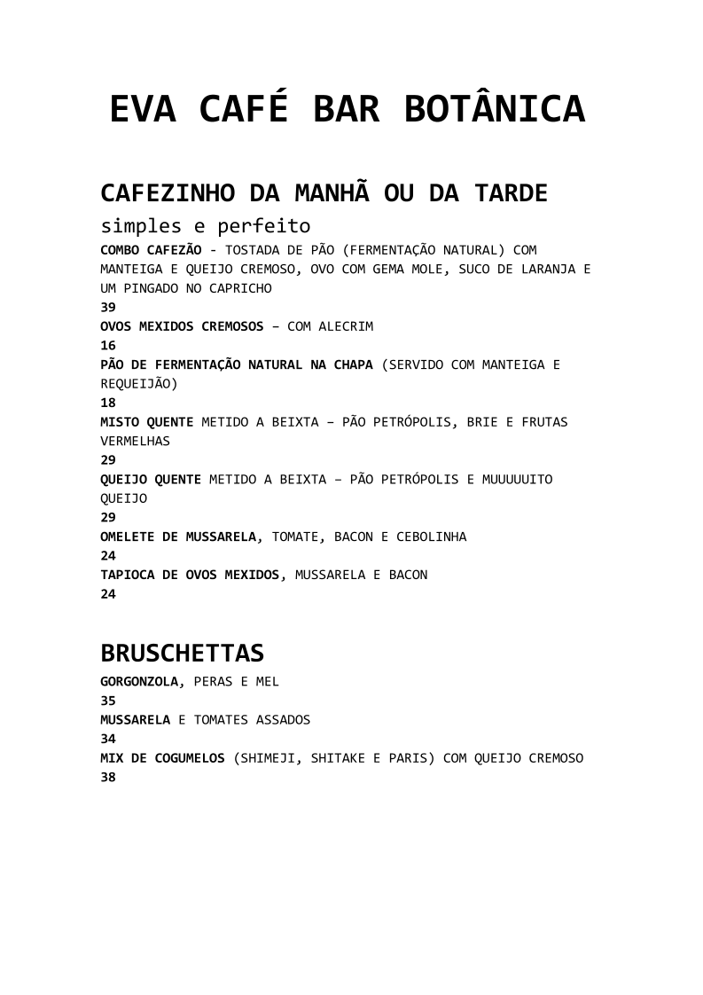 Eva Café Bar e Botânica offers a menu that blends simple café comforts with casual, thoughtful bites ideal for leisurely afternoons. The selection focuses on cozy, familiar flavors complemented by a touch of rustic charm, reflecting the warm and inviting atmosphere of the space.