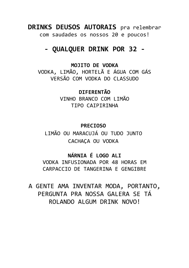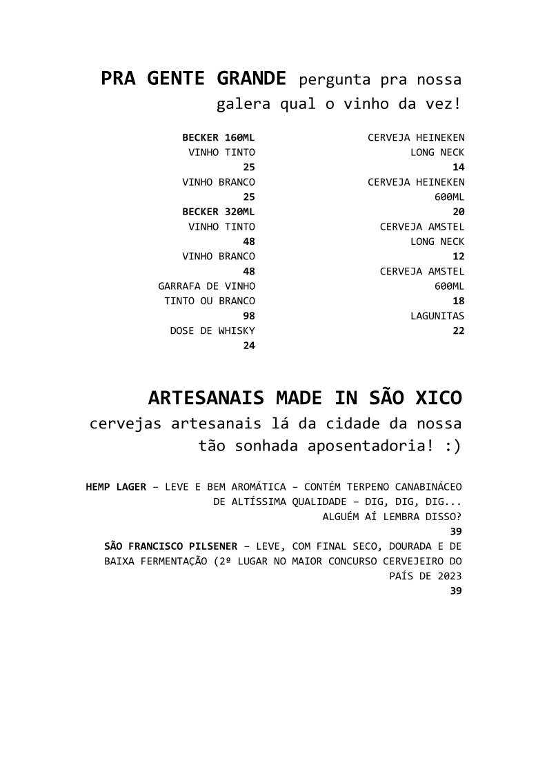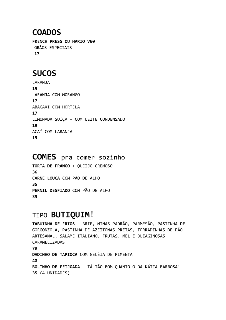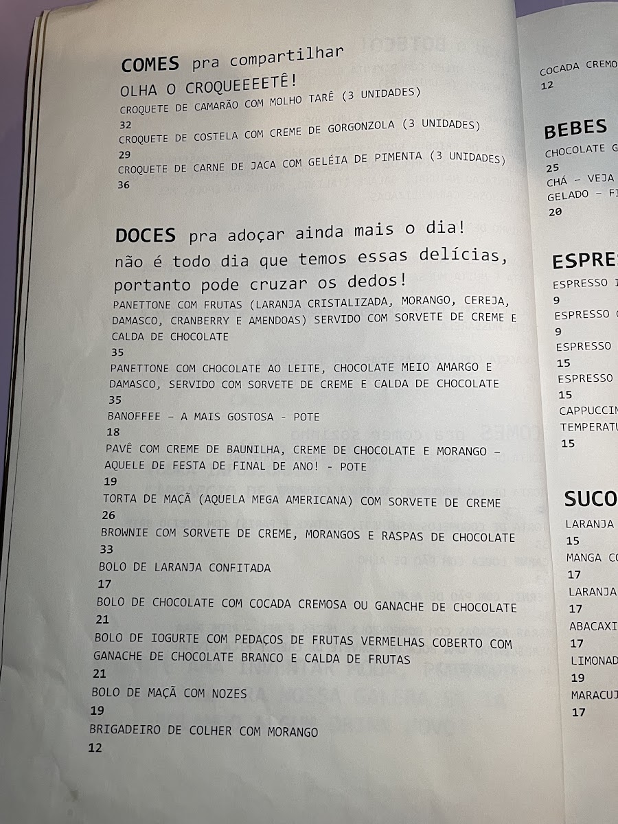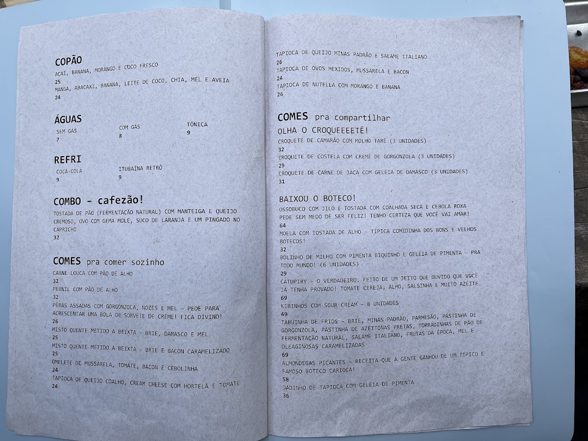 The food menu features comforting snacks and light meals that pair well with the drinks and the setting. Examples include savory choices such as the toast de avocado com cogumelos and tostada de shitake com gorgonzola, alongside sweet treats like bolo de laranja, bolo de cenoura, and the indulgent brigadeiro de colher. Items like dadinho de tapioca com geleia and bolinho de chuva com doce de leite bring a touch of traditional Brazilian comfort food that complements the café’s casual vibe.