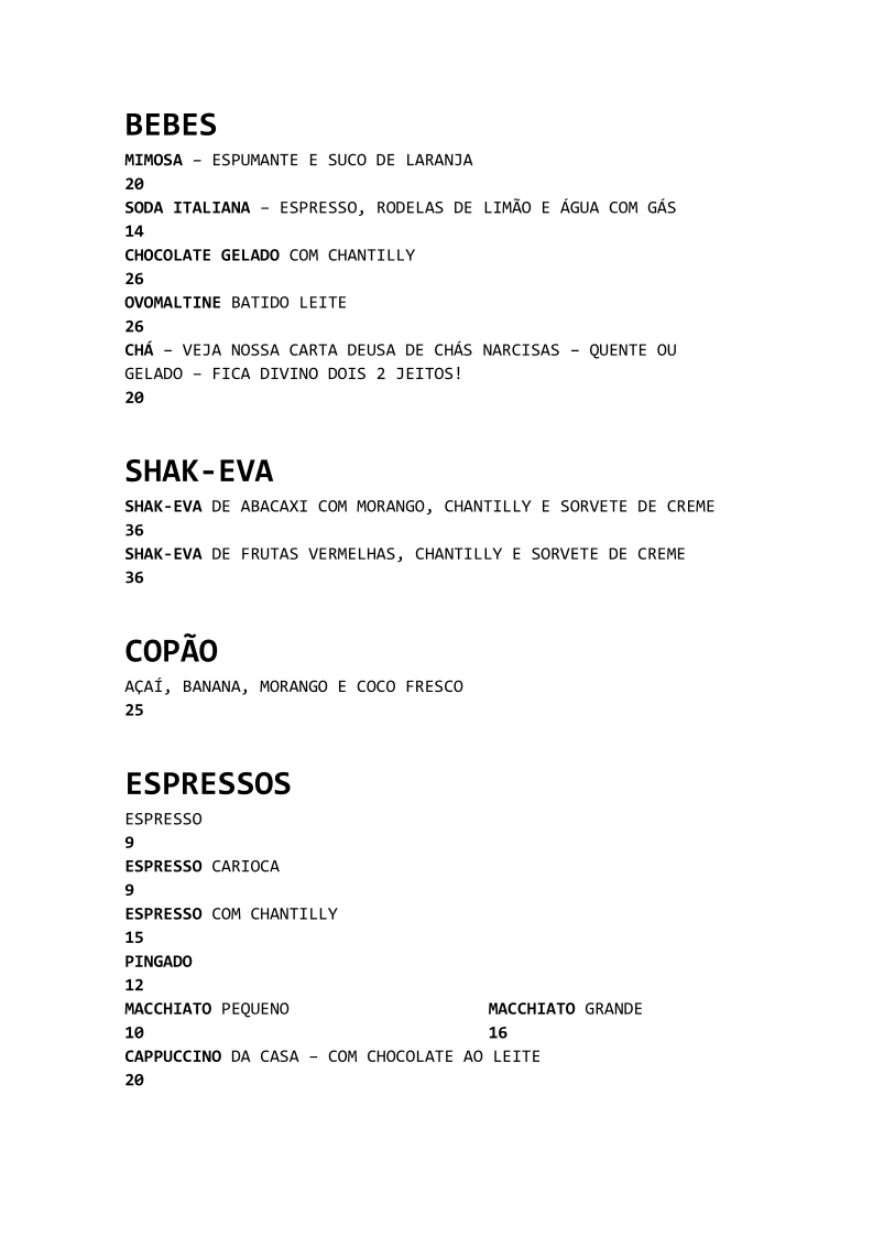 Guests can enjoy a variety of drinks ranging from classic coffee preparations like latte, cold brew, and the stronger cafezão to more refreshing options such as the mojito or the traditional Brazilian caipirinha de limão. These beverages suit relaxed moments, whether starting your day, taking a midday pause, or winding down after work.